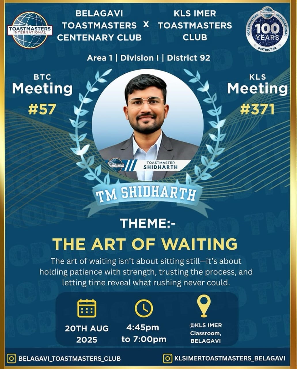 Belagavi Toastmasters Centenary Club and KLS IMER Toastmasters Club come together for a powerful joint meeting featuring Toastmaster Shidharth as the Toastmaster of the Day.
